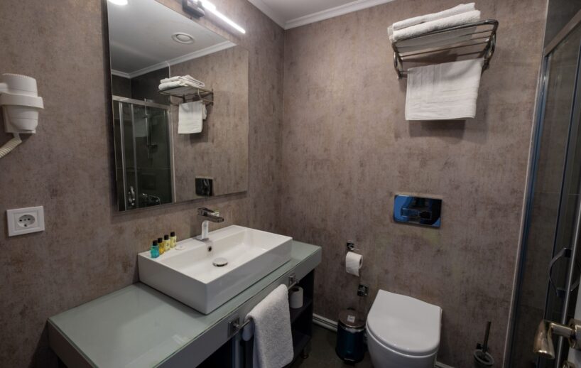 Banyo alanı, modern bir lavabo ünitesi, geniş bir ayna, saç kurutma makinesi ve kaliteli banyo malzemeleriyle donatılmıştır. Ek olarak, odada kahve ve çay hazırlamanız için bir kettle, su ikramı ve mini buzdolabı yer alır. Açılabilir pencereler sayesinde odanızı ferahlatabilir, şehrin canlı manzarasını keyifle izleyebilirsiniz.